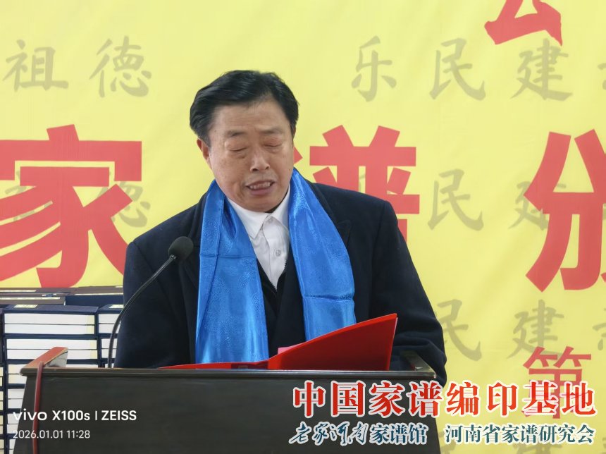 牛振合首先代表河南省姓氏文化研究会家谱委员会、河南省家谱文化研究院,向封丘李氏宗谱颁谱大会的胜利召开表示最热烈的祝贺!向为续修宗谱呕心沥血、付出艰辛努力的以主编李连臣为代表的编委会全体成员、各位宗贤以及所有关心支持谱牒工作的乡亲们,致以最崇高的敬意!
