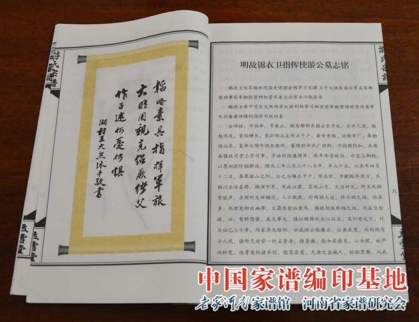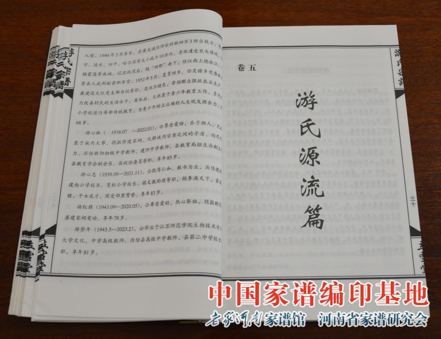 由河南省家谱文化研究院(老家河南家谱馆)编辑并出版的苏北盐城西乡交睦庄《游氏家乘》,采用仿古、线装、薄宣纸印刷,分上、下两册,共520余页。记载了该支游氏从明朝正统年间到今约600年传承史。
