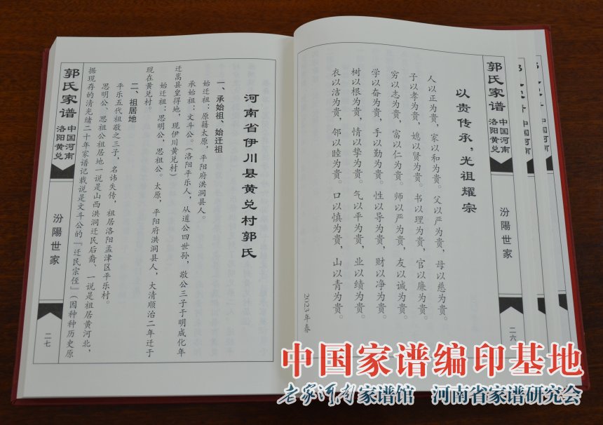 日前,由中国家谱编印基地(河南省家谱研究会、河南省家谱文化研究院)负责设计排版的《河南洛阳黄兑郭氏家谱》印刷完毕、顺利交付。