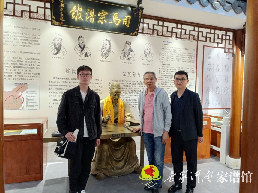图为:司马氏宗谱馆荣誉馆长司马众志(中)、副秘书长司马伟杰(右1)的陪同下,马佳俊(左1)参观了根在河南家谱馆、司马氏宗谱馆。