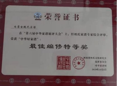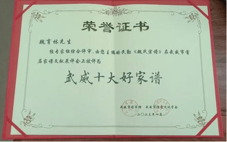 该谱在“第六届中华家谱展评大会”上,荣获“最佳编修特等奖”;在武威市首届家谱文献展评会上被评为“武威十大好家谱”。